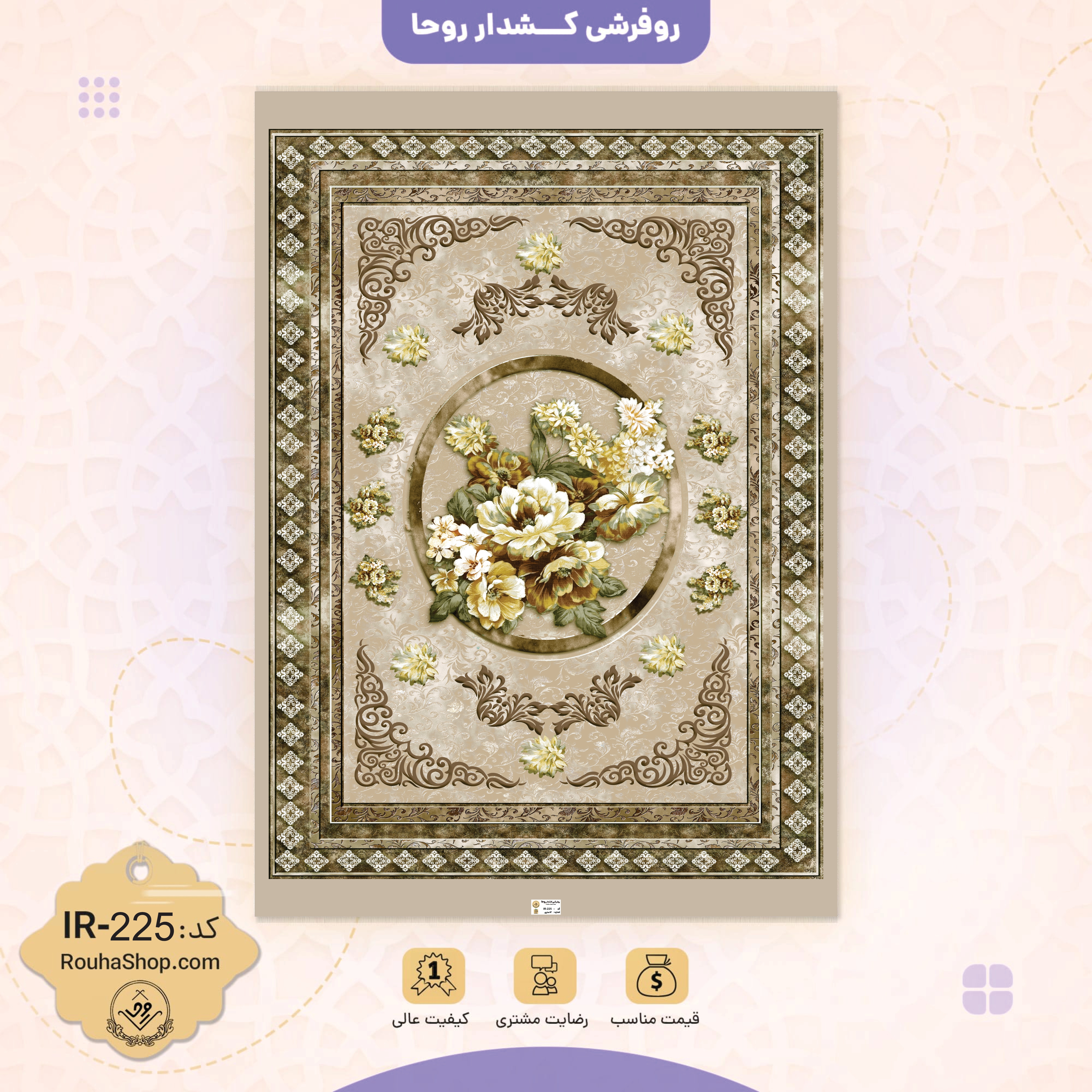 خرید روفرشی کشدار کد IR-225، روفرشی زیبا و نفیس از جنس پارچه مخمل شانل ، تولید شده توسط گروه تولیدی روحا. پارچه این روفرشی مانند دیگر محصولات روحا ، در شهر یزد و با استفاده از آخرین تکنولوژی های موجود دنیا، از نخ “شانل” بسیار متراکم و با مدرن ترین تکنولوژی ها تولید شده است. از آن جا که گروه تولیدی روحا در تولیدی روفرشی IR-225 و دیگر روفرشی ها از متریال اروپایی و بهترین نوع جوهر استفاده می کند ،نیازی نیست نگران رنگ پریدگی یا پس دادن رنگ این روفرشی ها باشید. اگر قصد خرید روفرشی کشدار طرح سنتی دارید خوب است بدانید روفرشی های روحا نسبت به نمونه های خارجی ضخامت بیشتری دارند.